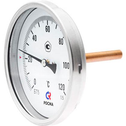 Термометр осевой биметаллический предназначен для измерения температуры жидкостей и газов в отопительных и санитарных установках, в системах кондиционирования и вентиляции. Принцип действия термометров БТ основан на зависимости деформации чувствительного элемента от измеряемой температуры. В качестве чувствительного элемента используется биметаллическая пружина. Биметаллическая пружина изготавливается из двух прочно соединенных металлических пластин, имеющих различные температурные коэффициенты линейного расширения. При изменении температуры пружина изгибается и вращает стрелку термометра. Один конец пружины закреплен внутри штока, а к другому присоединяется ось стрелки.